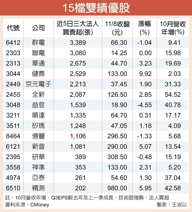 彙整法人的選股建議,挑選10月營收較去年同期成長、第三季每股稅後盈餘(EPS)較去年同期及上一季成長,同時股價技術面強勢及三大法人近五個交易日買超的個股有群電、聯電、華通、健鼎、京元電子、全新、益登、順達、矽瑪、億豐、新普、研華、神準、亞泰、精測等15檔個股。